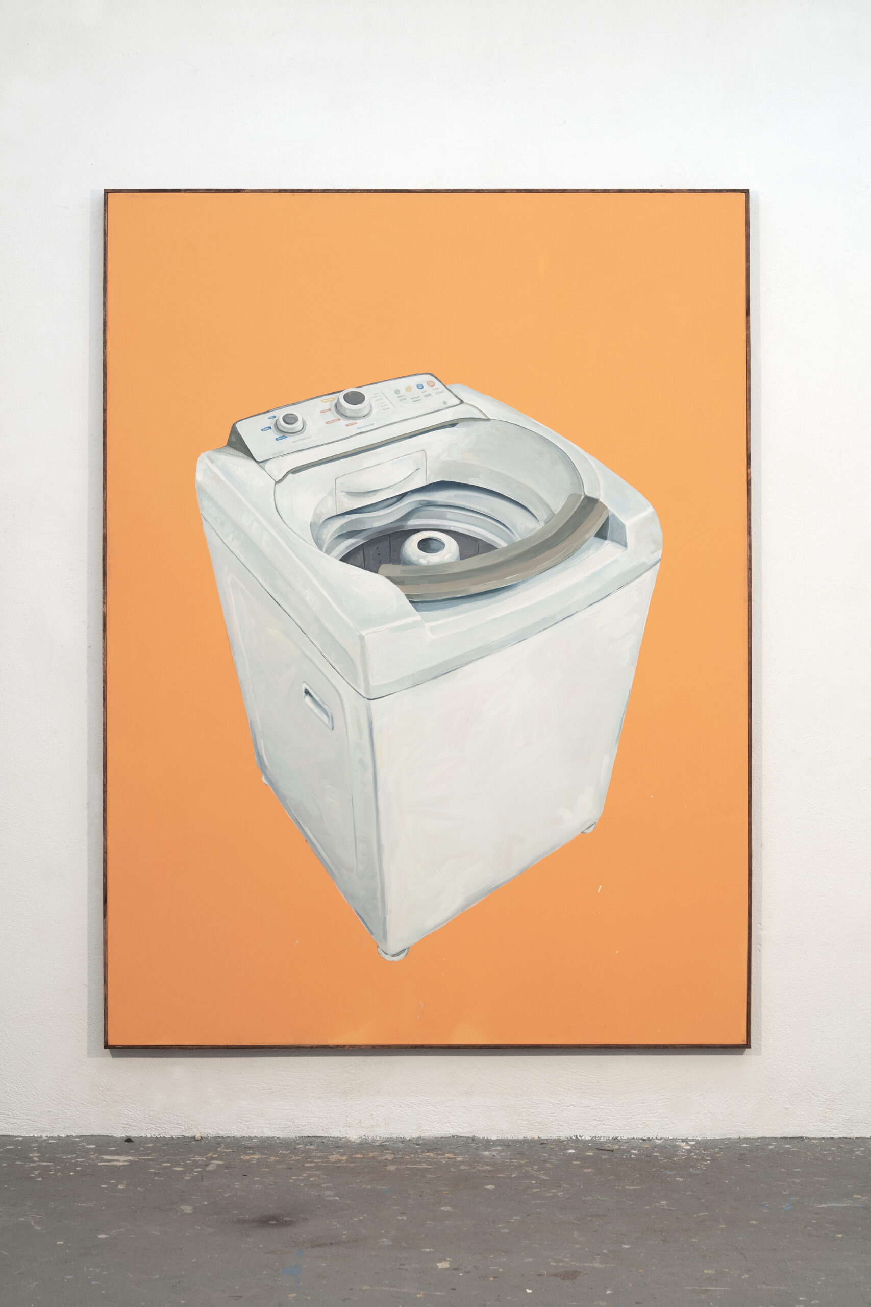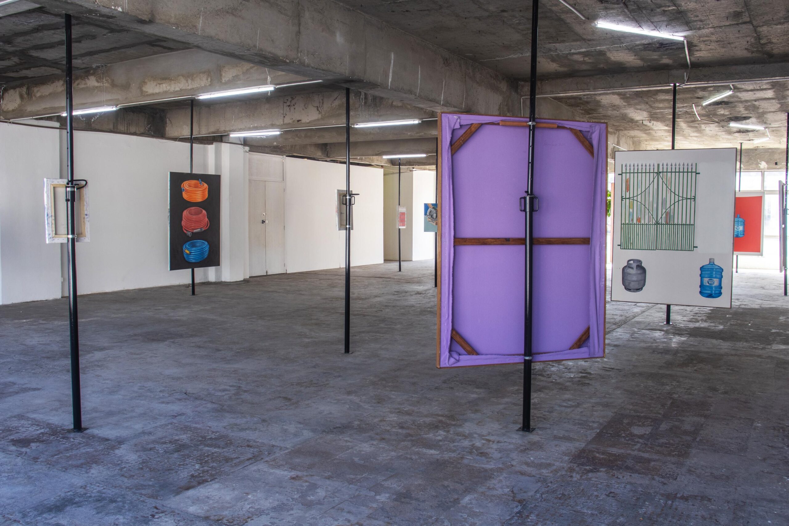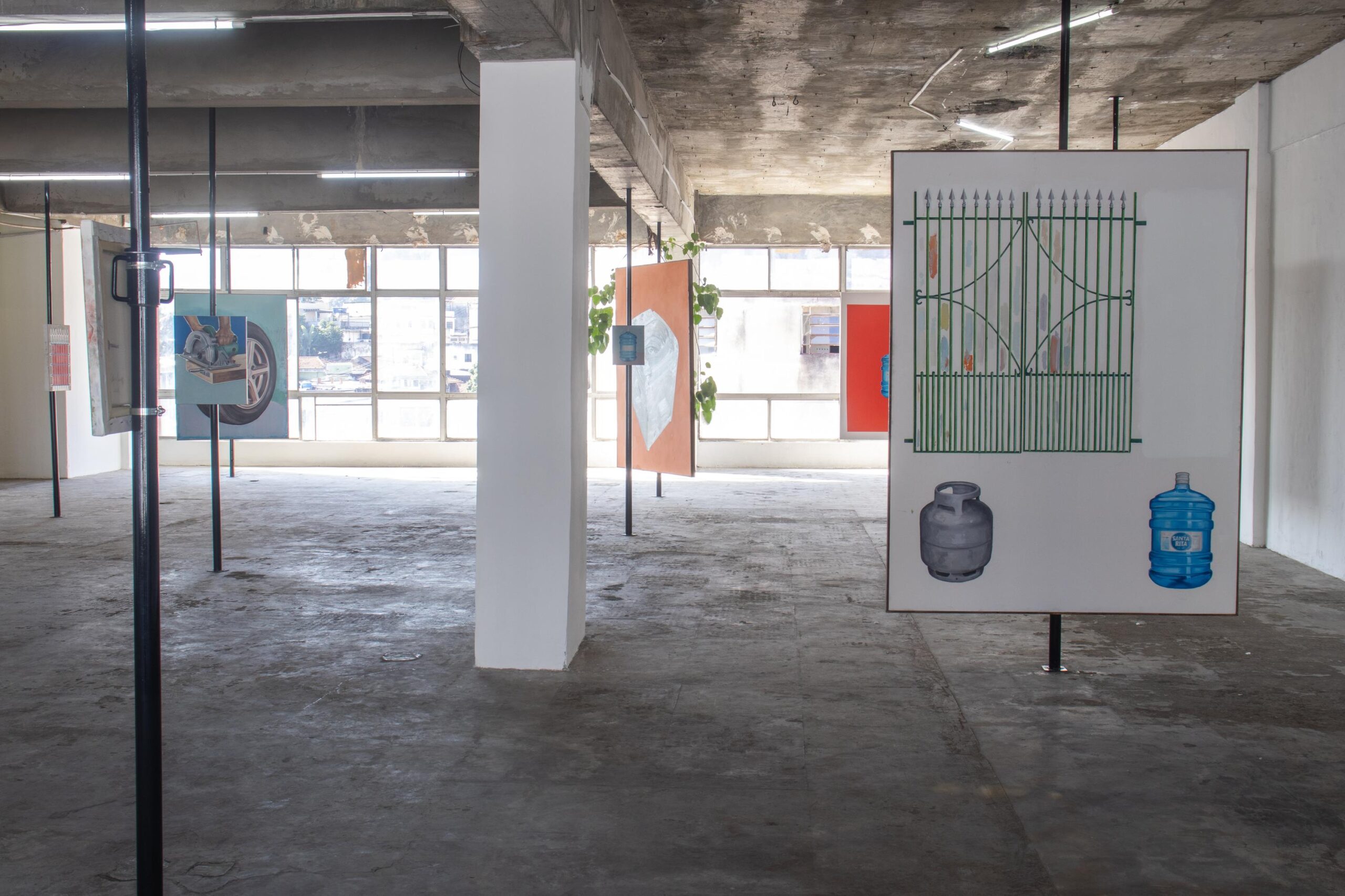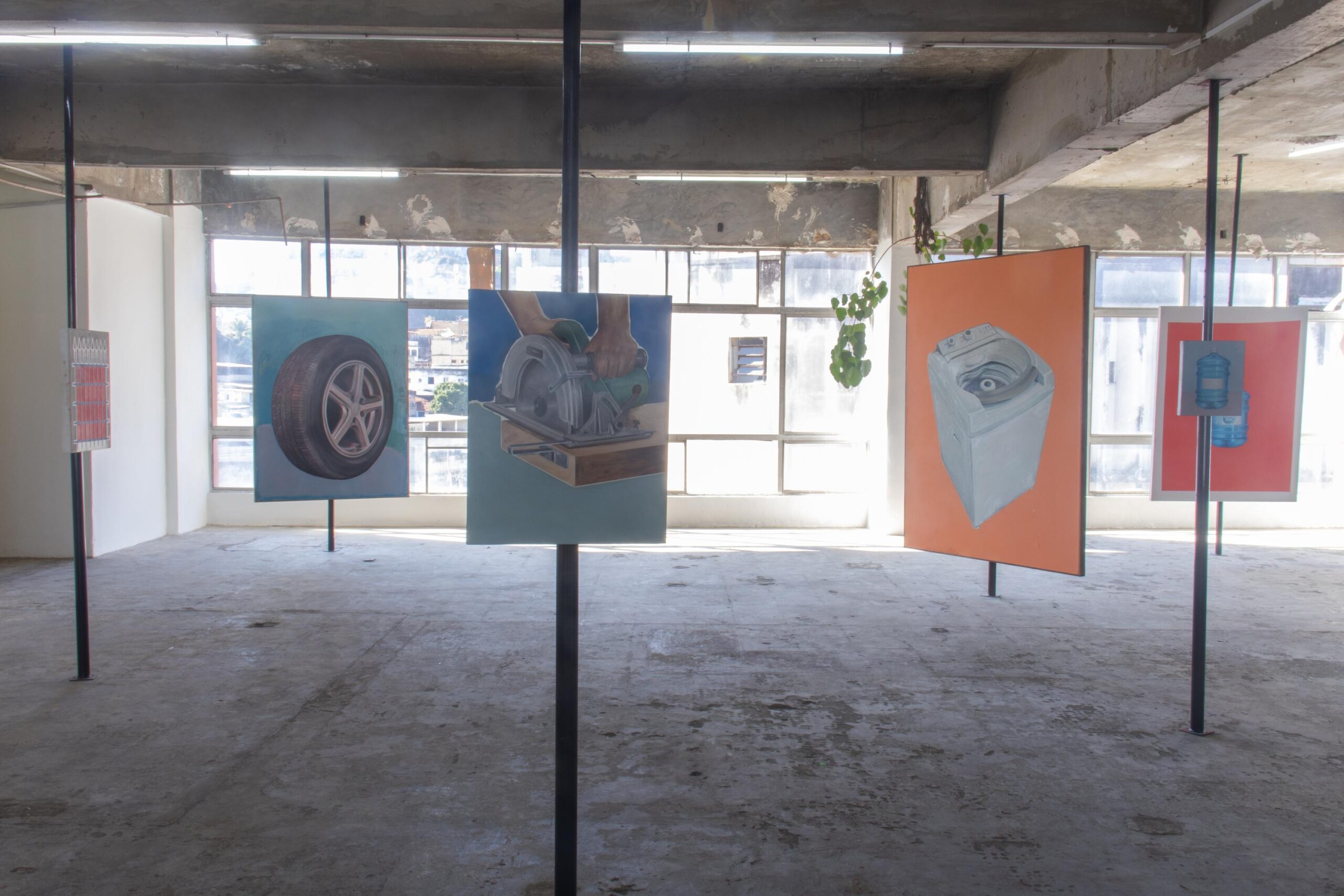 Dar-se conta dos objetos industriais retratados pelo artista é também questionar a respeito de quem normalmente empunha esses mesmos objetos, quem realiza tais gestos. É pensar como algumas coreografias cotidianas respondem aos recortes e às segmentações sociais que acabam determinantes de parte da paisagem urbana, industrial e doméstica, sobretudo no que concerne à raça, ao gênero e à classe. Em sua chegada na Refresco essas pinturas se misturam, no caso, à paisagem da zona portuária do Rio de Janeiro. Com suas janelas vazadas, a galeria revela o espaço do dia a dia de uma das regiões mais tradicionais da cidade, que desde cedo foi marcada por usos considerados “pouco nobres”, como atividades fabris e ocupação proletária, além de ter sido marcada pelo comércio escravocrata. Mesmo com tentativas e projetos visando transformações nesse tecido urbano, podemos e devemos questionar os desdobramentos práticos dessas iniciativas. É um território onde modalidades de ocupação estão permanentemente em disputa, por isso olhar por essa janela é também se perguntar sobre a população que ali habita e consequentemente constitui a vida desse lugar.