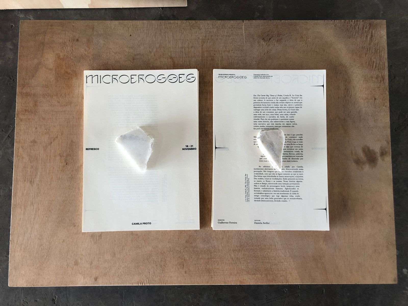 Microerosões, individual de Camila Proto é uma proposta selecionada a partir da chamada aberta realizada no final de 2019 pela Galeria REFRESCO. Na ocasião da abertura houve uma performance musical e ativação de trabalhos expostos. Apresentou um aglomerado de invenções geológicas que, como um derrame brilhante da realidade, se traduziram em oito obras multimídias, enquanto formações geográficas, escriturais e desejantes. São erosões imperceptíveis, mas nem por isso menos reais: as erosões do acaso, da linguagem, da memória… os tantos segredos gravados nas linhas do corpo e da paisagem.